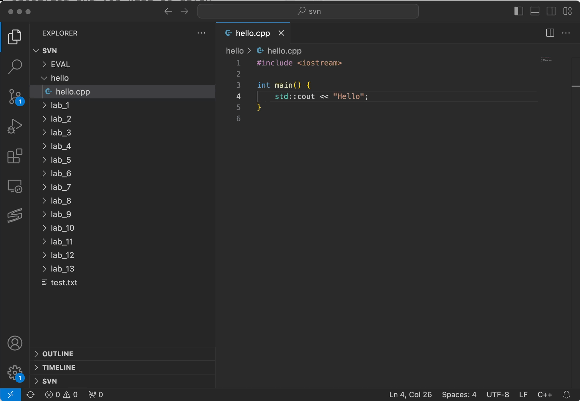 A VS Code extension can be used to submit assignments to your Subversion repository. This extension uses a Subversion client. To use the extension, you need to install both the Subversion client and the extension proper.