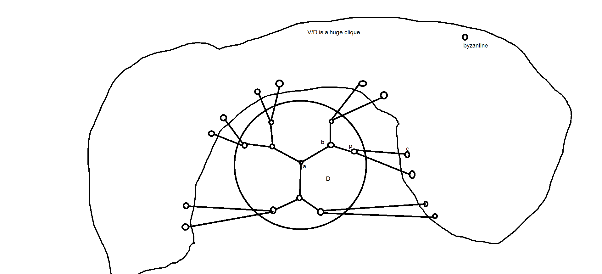 The Explorer algorithm is incorrect. Here is a counterexample (see the picture below). Assume the faulty node is located in a completely connected subcomponent V, and node a in component D. Suppose node a starts the message propagating the information about its neighborhood as described in Explorer. Meanwhile, the faulty node starts a message carrying the correct neighborhood of node a and the whole set of nodes N = V + D as a visited set.
