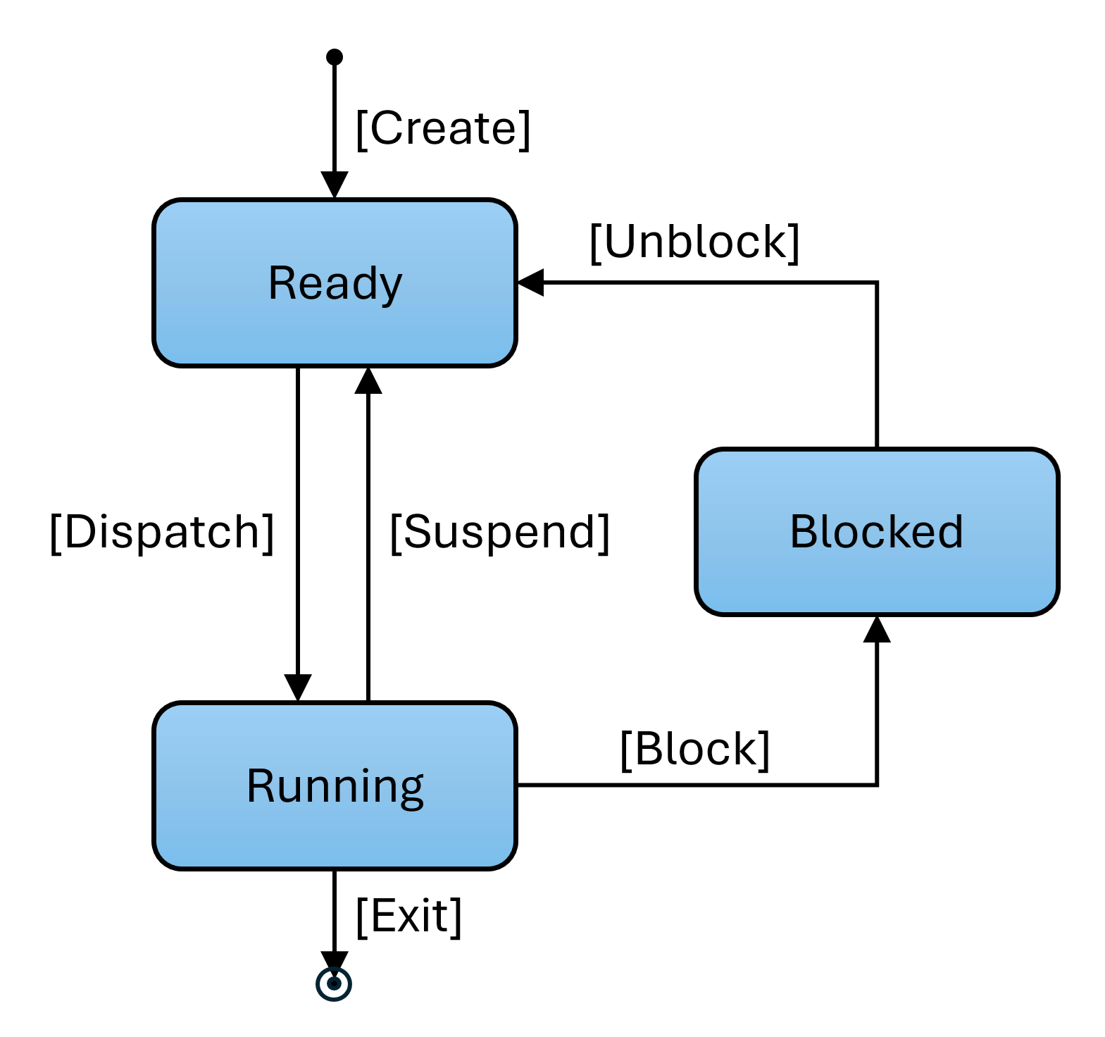 process 1 is runningIf the transition is not in the appropriate state, for example if dispatch is invoked on a process that is in running state, no action should be taken (no state transition should occur).