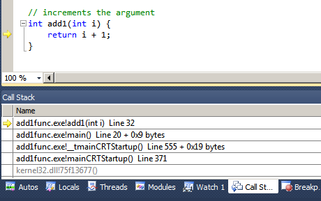 variables. MSVS display program stack in "Call Stack" tab of the
